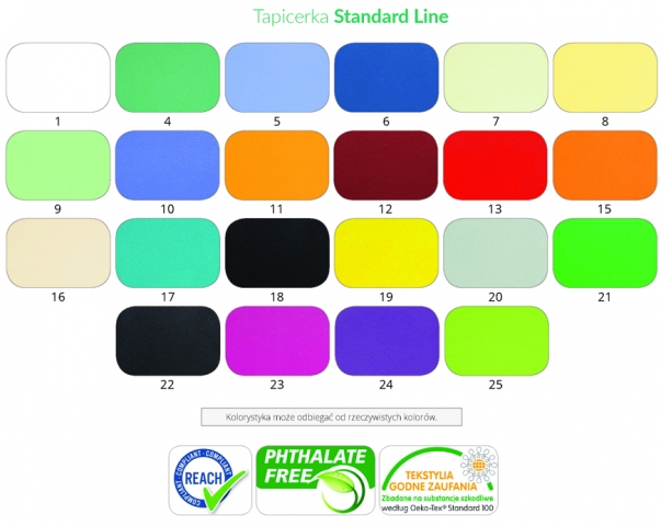 Povrchový materiál: Koženka je PVC potiahnutá so zvýšenou odolnosťou voči telesným tekutinám, olejom, alkoholom, ako aj dezinfekčným prostriedkom obsahujúcim aktívny chlór. Materiál sa môže používať v zariadeniach určených pre deti.